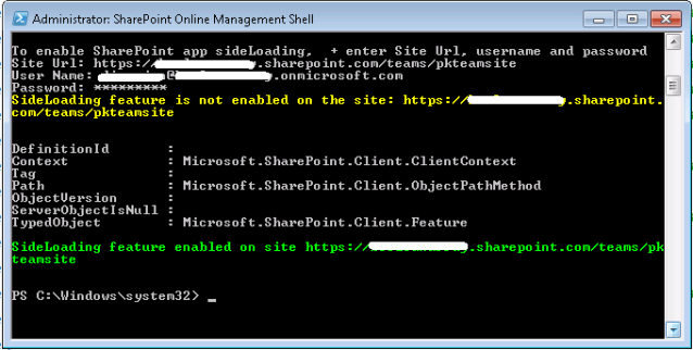 Write-Host 'To disable sideLoading, enter Site Url, username and password'